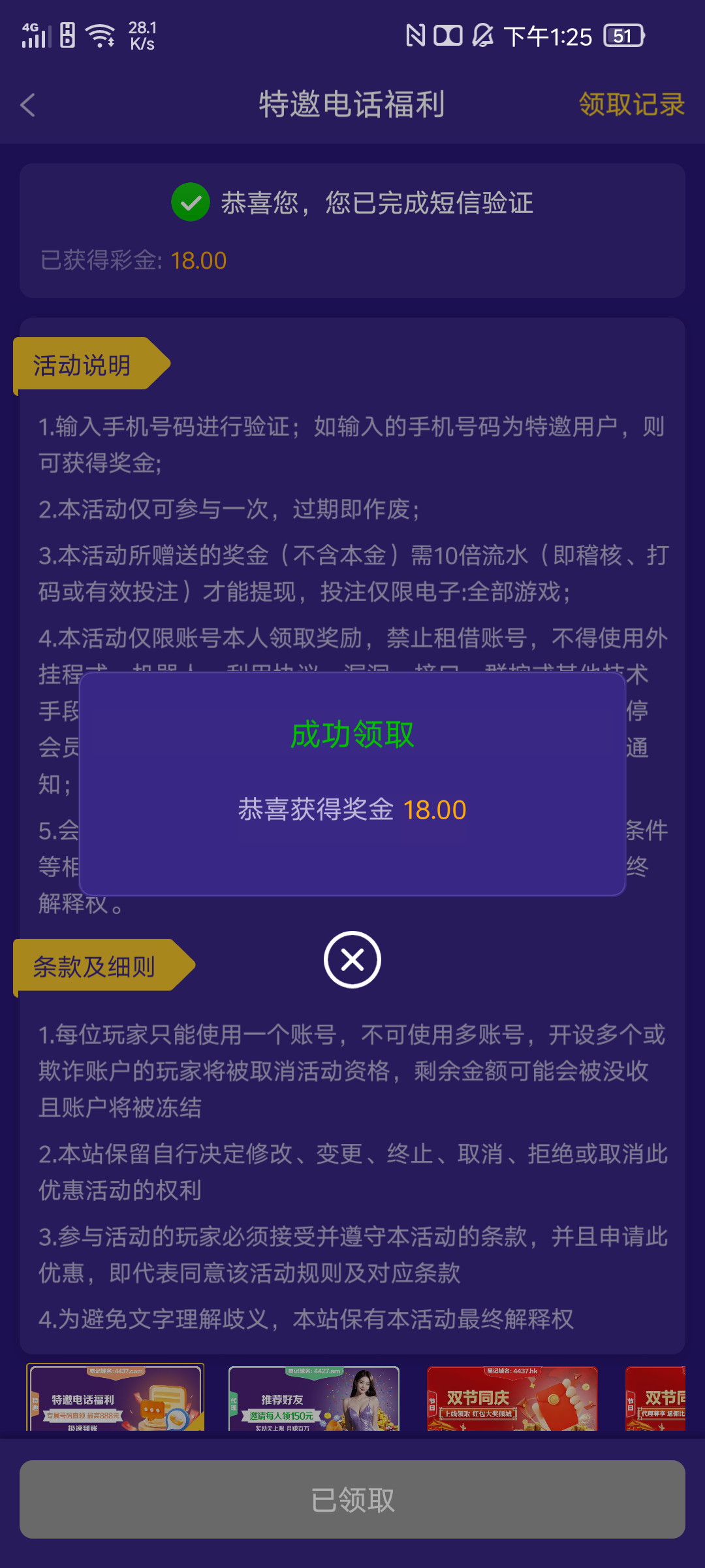 接到了电话,注册绑定特邀自助领了18彩金,麻将2拉了免费提了200到账