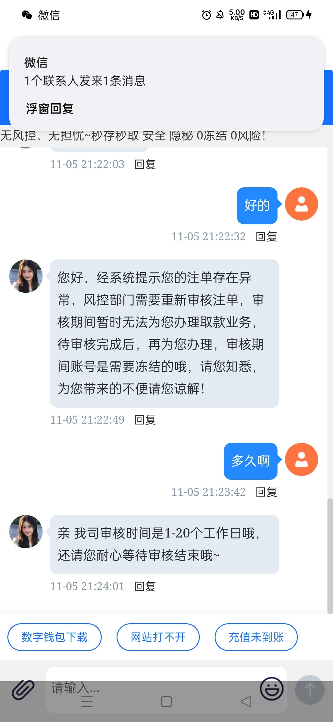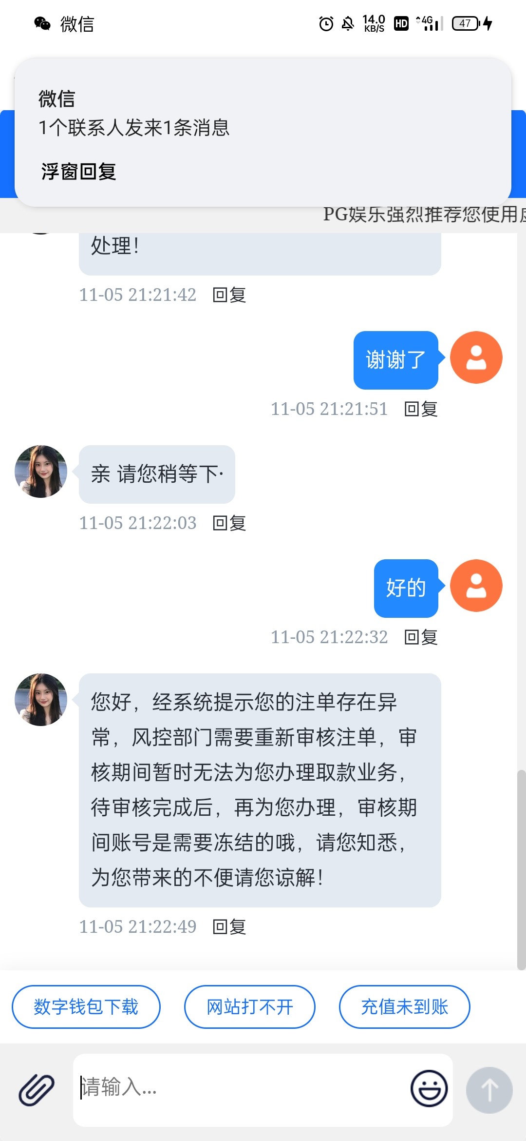 带本金一共20,打到100多提款一个半小时没到,登录去看账号封了,去问了客服,昨天客服聊天记录如图。