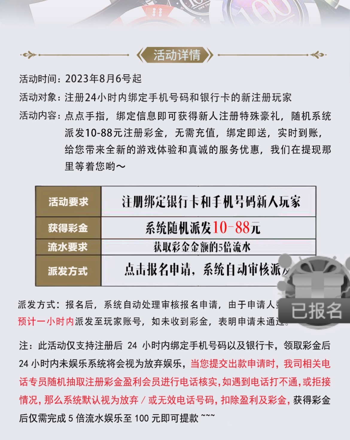 新用户注册绑卡自助领取10~88彩金